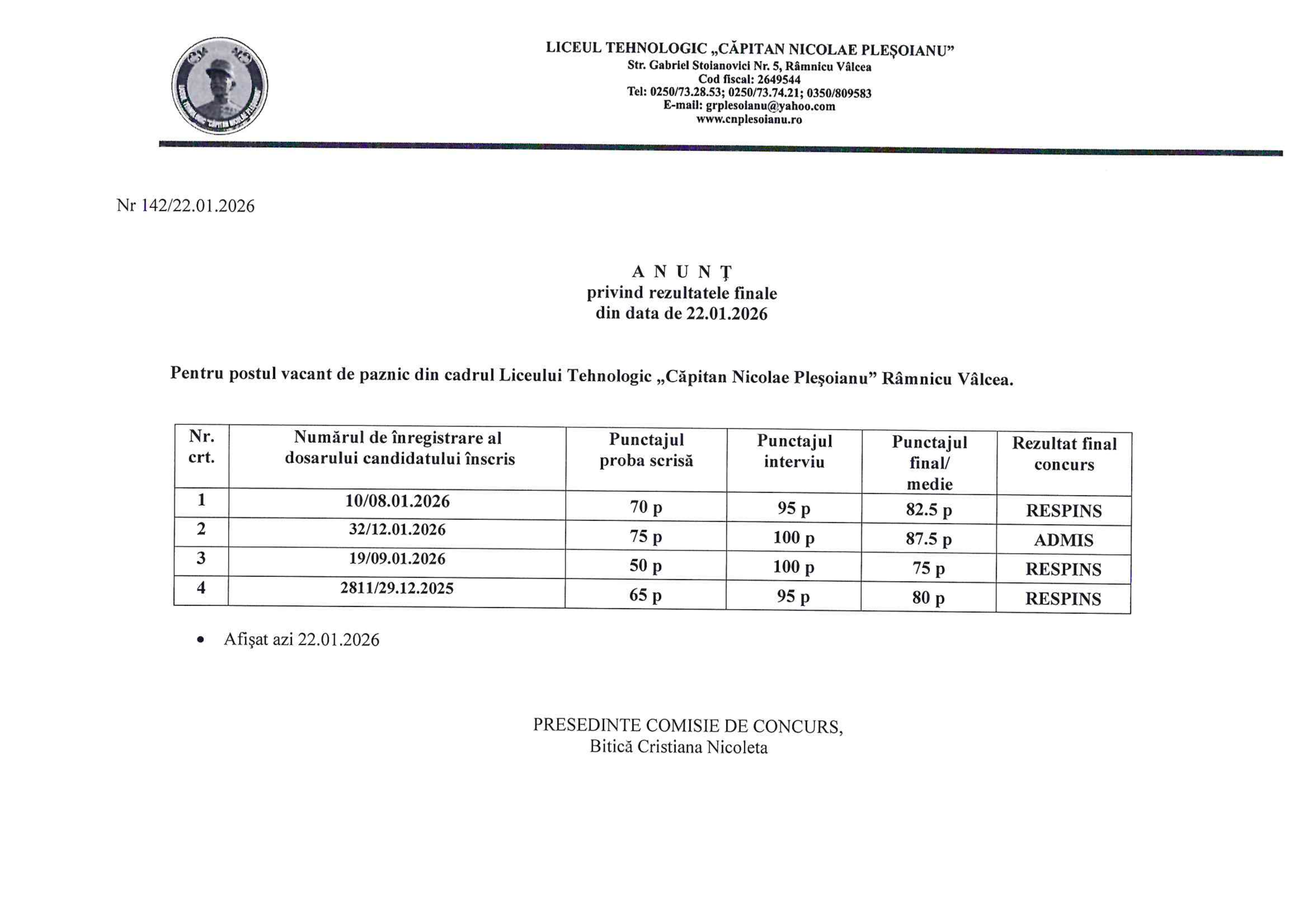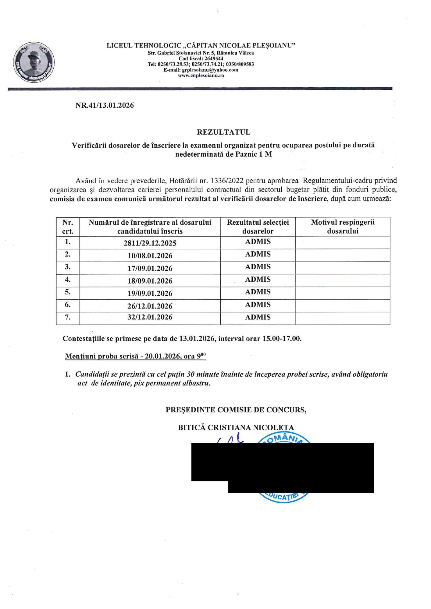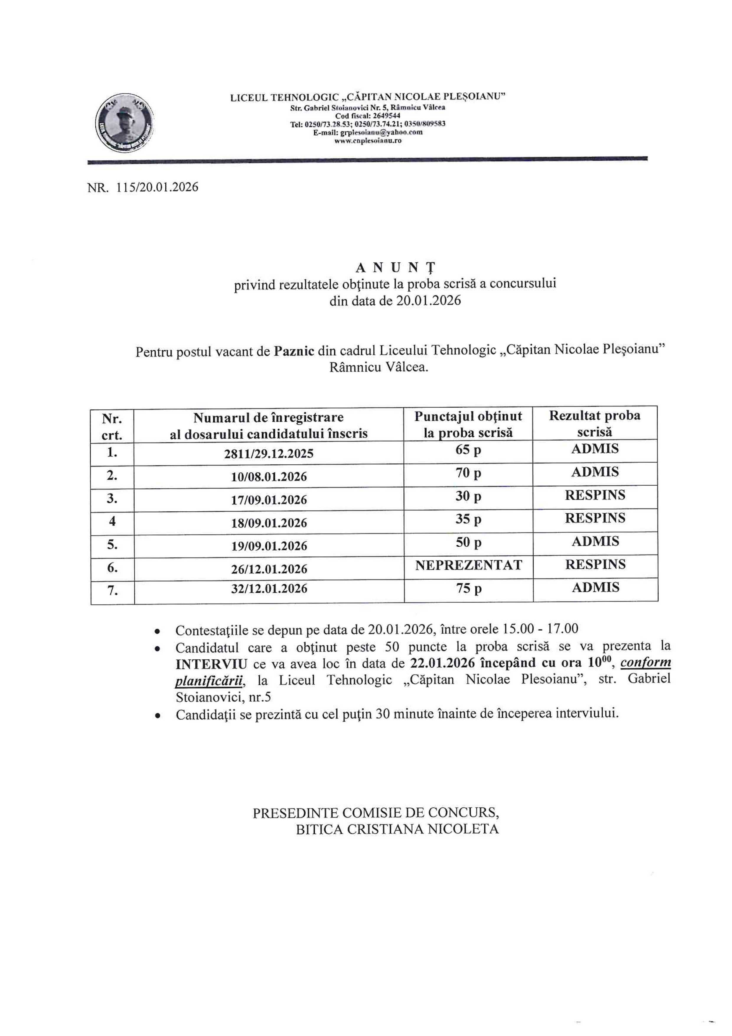 REZULTATE PROBA SCRISA - POST PAZNIC - 2026